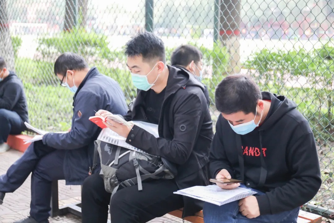 12:00,上午第一科目已考完,考生们下考后有的进入食堂就餐,还有的在我校特有的绿色氧吧环境中席地而坐为下午的考试进行紧张的复习。